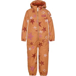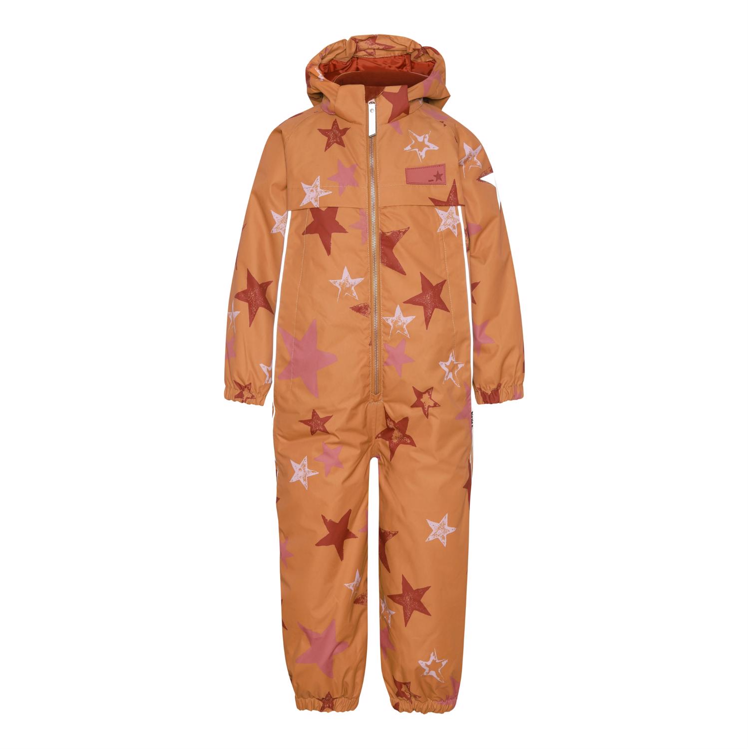 Pingo is Molo's new unisex snowsuit in a lovely golden colour with a star print. It has reflective piping and Molo's iconic star reflectors on the side and on the back. The snowsuit also has a slanted zip closure on the front. Pingo is windproof, waterproof and breathable and has taped seams. The lining and the interlining is 100% recycled and made of recycled plastic bottles. This product has a water resistant, PFC-free surface treatment (Does not contain, e.g. PFOS, PFOA, etc). Water coloumn pressure: 12.000 mm and breathable: 8.000 g/m2/24hr.