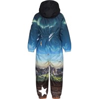Polar is a new snowsuit with a beautiful placement print with a landscape at the bottom and with a sky on top. Its outer and inner fabrics as well as lining are 100% recycled and made of recycled polyester. Polar has Molo's iconic star reflectors on the sleeves and legs. It has a snow flap at the legs and rubber stirrups under the feet. The snowsuit is made in a windproof, waterproof and breathable fabric and has taped seams. This product has a water resistant, PFC-free surface treatment (Does not contain, e.g. PFOS, PFOA, etc). Water column pressure: 10.000 mm. breathable: 10.000 g/m2/24hr.