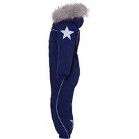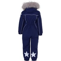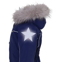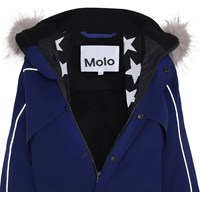 Polaris is a Molo favourite for cold weather, and it's now been recycled! Polaris Fur Recycled is a functional snowsuit in blue with a faux fur collar, reflective piping and Molo's iconic star reflectors on the sleeves and legs. It has a detachable hood, a front zip closure with placket, elastic at the back, a snow flap at the legs and rubber stirrups under the feet. The snowsuit is windproof and waterproof and has breathable 3M™ Thinsulate™. It has high quality fleece in vulnerable places as well as taped seams. The outer material is constructed in 59% recycled nylon from waste. This product has a water resistant, PFC-free surface treatment (Does not contain, e.g. PFOS, PFOA, etc). Water column pressure: 15.000 mm. Breathability: 15.000 g/m2/24hrs.