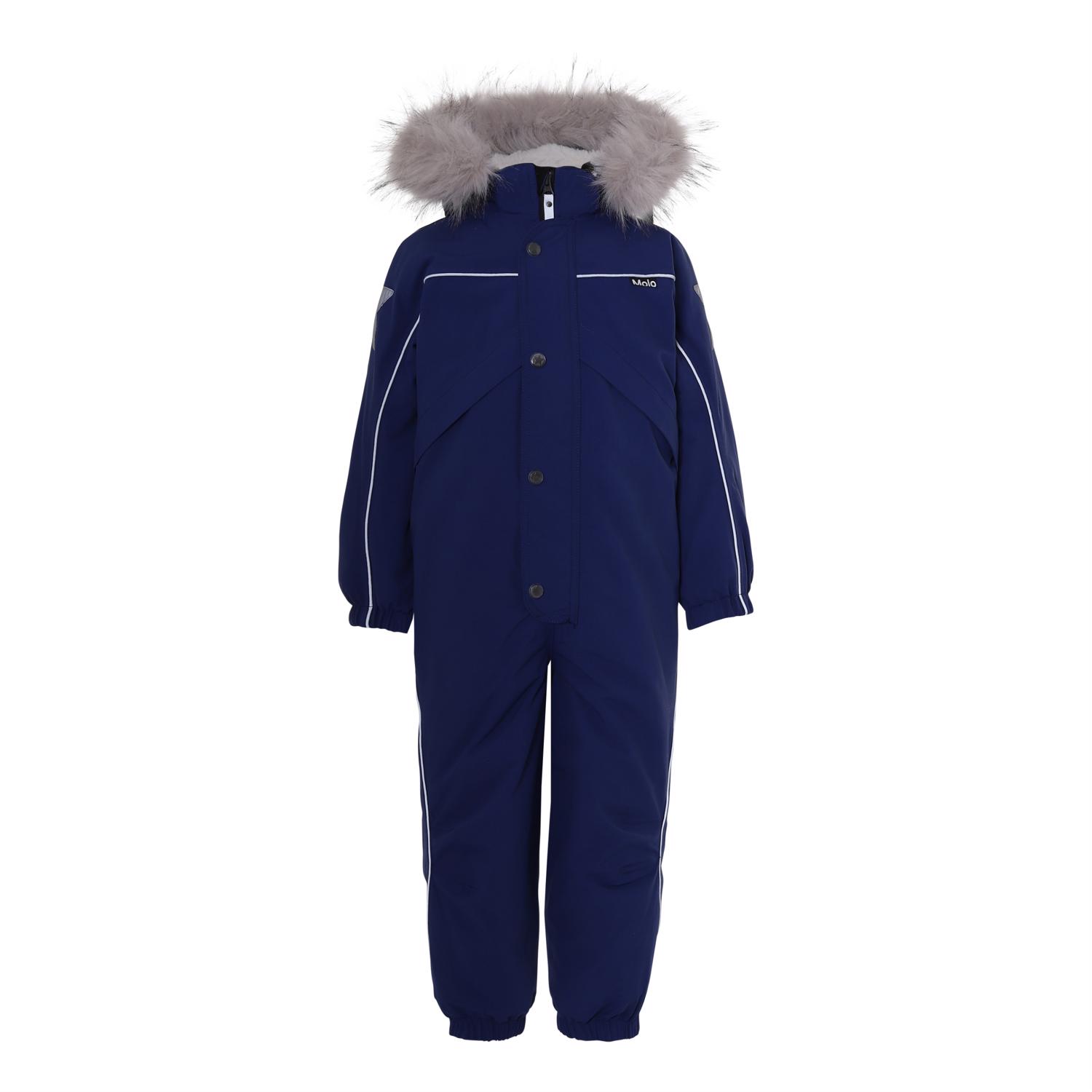 Polaris is a Molo favourite for cold weather, and it's now been recycled! Polaris Fur Recycled is a functional snowsuit in blue with a faux fur collar, reflective piping and Molo's iconic star reflectors on the sleeves and legs. It has a detachable hood, a front zip closure with placket, elastic at the back, a snow flap at the legs and rubber stirrups under the feet. The snowsuit is windproof and waterproof and has breathable 3M™ Thinsulate™. It has high quality fleece in vulnerable places as well as taped seams. The outer material is constructed in 59% recycled nylon from waste. This product has a water resistant, PFC-free surface treatment (Does not contain, e.g. PFOS, PFOA, etc). Water column pressure: 15.000 mm. Breathability: 15.000 g/m2/24hrs.