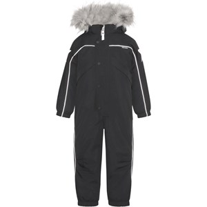 Polaris Fur is a Molo favourite when the weather turns really cold. Polaris, in addition to all its many well-known qualities, is now also made of partially recycled materials. This means the outer fabric is 51% recycled, while the lining and interlining are 100% recycled and made of recycled polyester. Polaris is a functional snowsuit in black with reflective piping and detachable faux fur trim. The snowsuit also has a detachable hood, a front zip closure with a placket, Molo's iconic star reflectors on the sleeves and legs. It has a snow flap at the legs and rubber stirrups for the feet. The snowsuit is made in a windproof, waterproof and breathable fabric and has taped seams. This product has a water resistant, PFC-free surface treatment (Does not contain, e.g. PFOS, PFOA, etc) and because of this, the snowsuit has been named 'Best-in-Test' . The water column pressure and breathability are greatly improved and are now: water coloumn pressure: 15.000 mm and breathable: 15.000 g/m2/24hr.