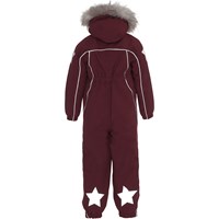 Polaris is a Molo favourite for really cold weather. It is a functional snowsuit in the color 'Cabernet' with reflective piping and Molo's iconic star reflectors on sleeves and legs. It has a faux fur collar. Polaris has a detachable hood, a covered zip front, elastic at the back, snow flaps at the legs and rubber stirrups. The snowsuit is constructed in windproof, waterproof and breathable fabric and lined in 3M™ Thinsulate™. It has high quality fleece at vulnerable places, and it has taped seams. This product has a water resistant, PFC-free surface treatment (Does not contain, e.g. PFOS, PFOA, etc). Because of this, it has received Best-in-Test status. Water column pressure: 10.000 mm. Breathable: 8.000 g/m2/24hr.