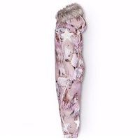 Snowsuit in recycled polyester for a cold winter with a beautiful horse print in shades of pink and purple on a dreamy background. The snowsuit has a detachable lined hood and a zip with a flap to keep wind and water out. There is elastic at the waist, sleeves and leg openings to keep snow, rain and wind out. The snowsuit has reflective tape along the side seams, around the hood, and large star-shaped reflectors on both the sleeves and legs, to increase visibility in traffic. The suit is lined with 3M™ Thinsulate™, which provides the child with greater mobility, and has lined front pockets with waterproof zippers.   Features: Windproof, waterproof and breathable. Water column pressure: 20,000mm. Breathability: 20,000 g/m2/24h. Waterproof seams. 3M™ Thinsulate™ insulation. PFC-free (PFOS and PFOA). Reflective edges and reflectors on legs and arms to increase visibility in traffic. Removable hood, lined with fleece and a removable faux fur trim. Internal fleece lining at the knees, bottom and back for extra insulation in exposed areas. Snow gaiter at the leg opening and removable rubber boot strap. Fleece lining in pockets.