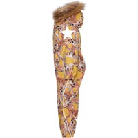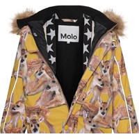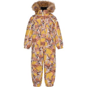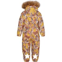 Polaris Fur is a Molo favourite when the weather turns really cold. Polaris, in addition to all its many well-known qualities, is now also made of partially recycled materials. This means the outer fabric is 51% recycled, while the lining and interlining are 100% recycled and made of recycled polyester. Polaris is a functional snowsuit in yellow with a deer print. It has reflective piping and detachable faux fur trim. The snowsuit also has a detachable hood, a front zip closure with a placket, Molo's iconic star reflectors on the sleeves and legs. It has a snow flap at the legs and rubber stirrups for the feet. The snowsuit is made in a windproof, waterproof and breathable fabric and has taped seams. This product has a water resistant, PFC-free surface treatment (Does not contain, e.g. PFOS, PFOA, etc) and because of this, the snowsuit has been named 'Best-in-Test' . The water column pressure and breathability are greatly improved and are now: water coloumn pressure: 15.000 mm and breathable: 15.000 g/m2/24hr.