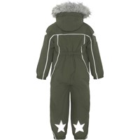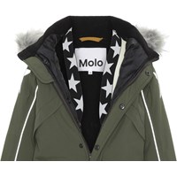 Polaris Fur is on of Molo''s favourites for really cold weather. Polaris is a functional snowsuit in green with reflective piping. It is perfect for extremely cold days but also ordinary winter days. The high level of breathability helps regulate a child''s body temperature so it does not become too cold or over heated. On warmer winter days, a child can wear the jacket with a thin under layer, but on extremely cold days, you can add an extra layer underneath. Polaris is also a good choice for less active moments. The snowsuit has reflector piping and a faux fur trim that is detachable. Polaris has a detachable hood, a covered front zip closure and Molo''s iconic star reflectors on the sleeves and legs. It has snow flaps at the legs and rubber stirrups. Polaris, in addition to all its other qualities, is now made from partially recycled materials. The outer fabric is made from 59% recycled nylon, the 3M™ Thinsulate™ padding from 83% recycled polyester and the lining from 100% recycled polyester. The snowsuit is windproof, waterproof and breathable and has taped seams. This product has a water-resistant, PFC-free surface treatment (Does not contain, e.g. PFOS, PFOA, etc). Because of this, it has received Best-in-Test status. The water column pressure and breathability have been imporved and are now up to 15.000 mm column pressure and breathability at 15.000 g/m2/24hr.