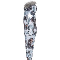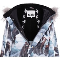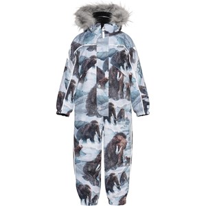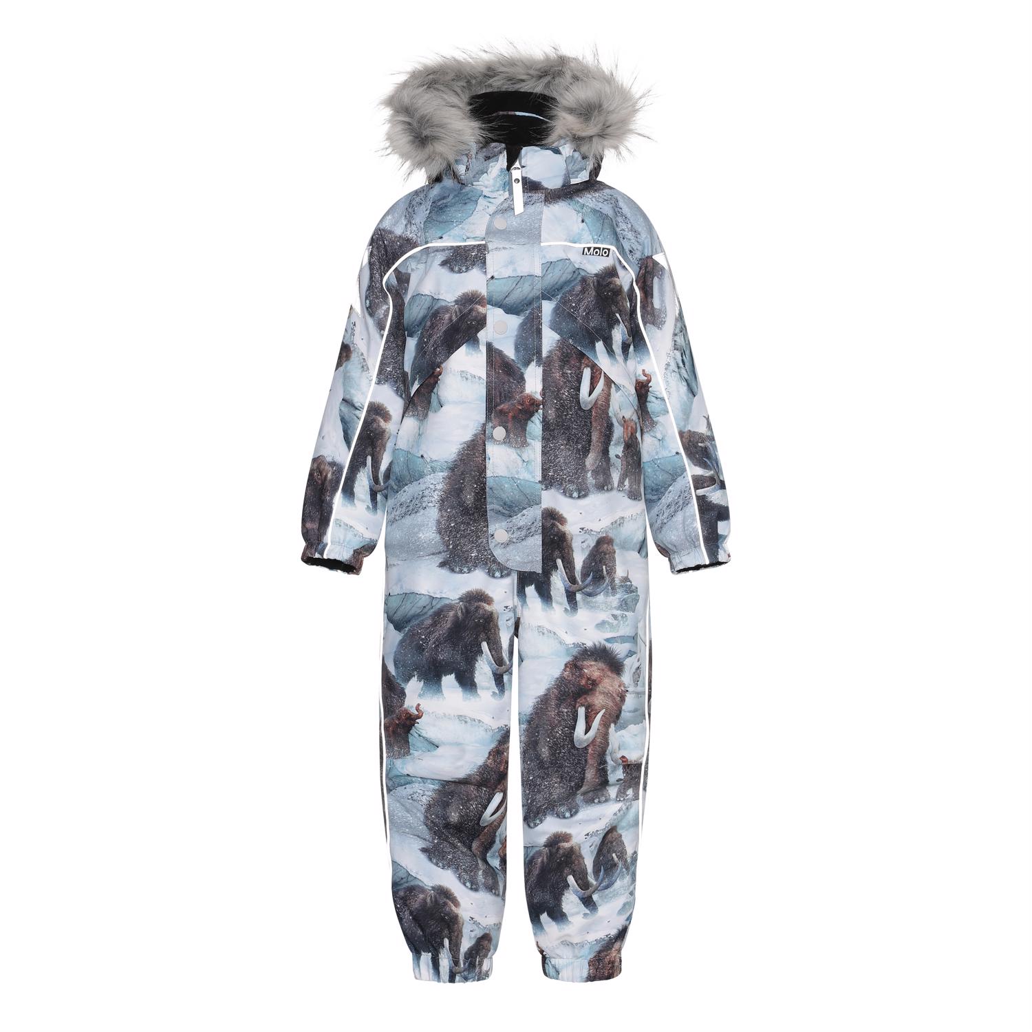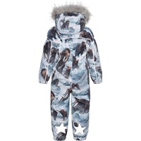 Polaris Fur is a Molo favourite when the weather turns really cold. Polaris, in addition to all its many well-known qualities, is now also made of partially recycled materials. This means the outer fabric is 51% recycled, while the lining and interlining are 100% recycled and made of recycled polyester. Polaris is a functional snowsuit in light blue with a mammoth print. It has reflective piping and detachable faux fur trim. The snowsuit also has a detachable hood, a front zip closure with a placket, Molo's iconic star reflectors on the sleeves and legs. It has a snow flap at the legs and rubber stirrups for the feet. The snowsuit is made in a windproof, waterproof and breathable fabric and has taped seams. This product has a water resistant, PFC-free surface treatment (Does not contain, e.g. PFOS, PFOA, etc) and because of this, the snowsuit has been named 'Best-in-Test' . The water column pressure and breathability are greatly improved and are now: water coloumn pressure: 15.000 mm and breathable: 15.000 g/m2/24hr.