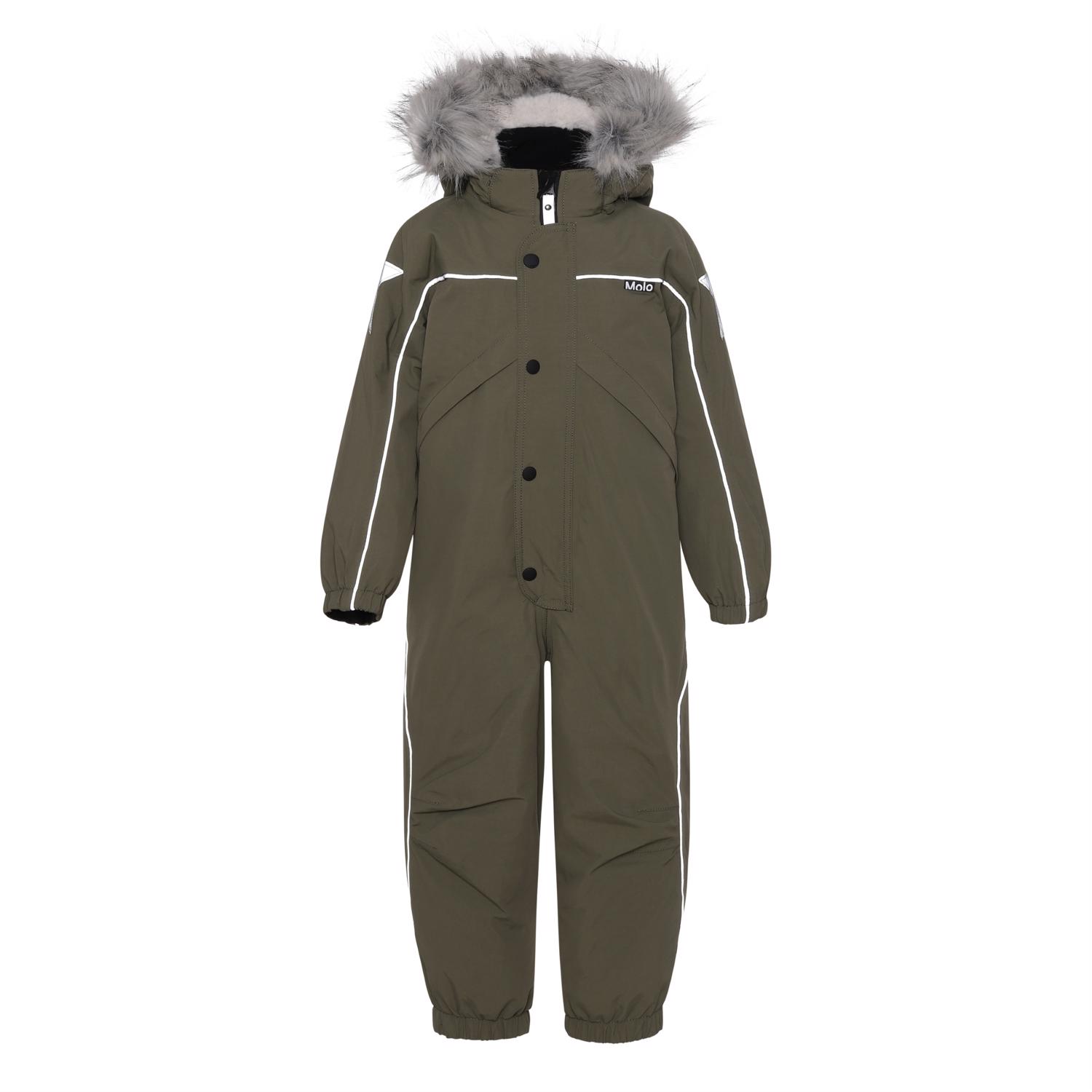 Polaris Fur is a Molo favourite when the weather turns really cold. Polaris, in addition to all its many well-known qualities, is now also made of partially recycled materials. This means the outer fabric is 51% recycled, while the lining and interlining are 100% recycled and made of recycled polyester. Polaris is a functional snowsuit in green. It has reflective piping and detachable faux fur trim. The snowsuit also has a detachable hood, a front zip closure with a placket, Molo's iconic star reflectors on the sleeves and legs. It has a snow flap at the legs and rubber stirrups for the feet. The snowsuit is made in a windproof, waterproof and breathable fabric and has taped seams. This product has a water resistant, PFC-free surface treatment (Does not contain, e.g. PFOS, PFOA, etc) and because of this, the snowsuit has been named 'Best-in-Test' . The water column pressure and breathability are greatly improved and are now: water coloumn pressure: 15.000 mm and breathable: 15.000 g/m2/24hr.
