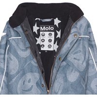 There''s a reason Polaris is one of Molo''s most beloved snowsuits: It has achieved best-in-test status and has been one of the best snowsuits on the market for many years. This is not only because of its many qualities, like extremely high-water column pressure and breathability, but also because Polaris always comes in beautiful prints and colours that children love. Molo doesn''t compromise on anything when it comes to this snowsuit, and it is constructed in responsibly produced, recycled materials. This Polaris is in a blue denim look with a print of fun smiley faces.