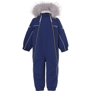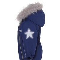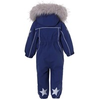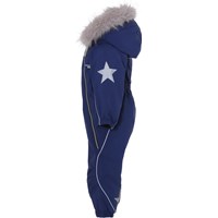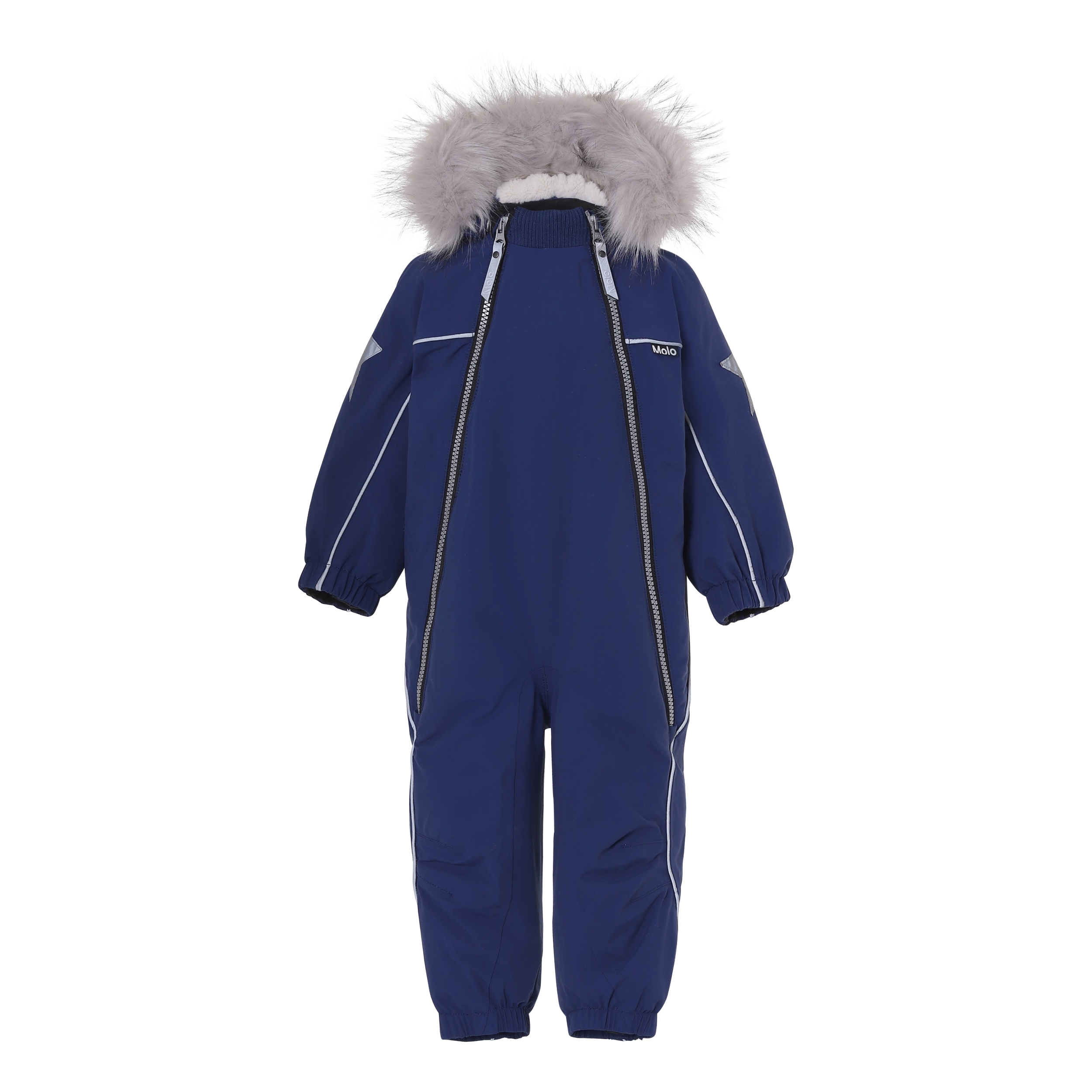 Pyxis Fur Recycle is a functional snowsuit for babies and small children in blue. It has a detachable hood with a faux fur edge, two slanted zippers for easy dressing, snow flaps and rubber stirrups at the legs and Molo's iconic star reflectors at the top of the sleeves and at the back of the legs. The snowsuit is constructed in a windproof, waterproof and breathable quality with 3M™ Thinsulate™. It has high quality fleece in vulnerable places and taped seams. The outer material is constructed in 59% recycled nylon from waste. This product has a water resistant, PFC-free surface treatment (Does not contain, e.g. PFOS, PFOA, etc). Water column pressure: 15.000 mm. Breathability: 15.000 g/m2/24hrs.