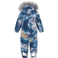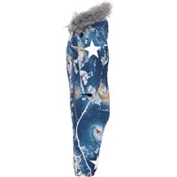 Pyxis is a functional snowsuit for babies and small children in blue with an astronaut print. Pyxis is perfect for extremely cold days but also ordinary winter days. The high level of breathability helps regulate a child's body temperature so it does not become too cold or overheated. On warmer winter days, a child can wear the jacket with a thin underlayer, but on extremely cold days, you can add an extra layer underneath. Pyxsis is also a good choice for less active moments. It has a detachable hood, two slanted zippers for easy dressing, snow flaps at the legs and rubber stirrups. Pyxis has Molo's iconic star reflectors on the upper arms and on the back of the legs. The snowsuit is windproof, waterproof and breathable. The outer fabric is made from 45% recycled polyester, the 3M™ Thinsulate™ padding from 83% recycled polyester and the lining from 100% recycled nylon. The snowsuit has taped seams. This product has a water-resistant, PFC-free surface treatment (Does not contain, e.g. PFOS, PFOA, etc). Water column pressure: 15.000 mm. Breathable: 15.000 g/m2/24hr.