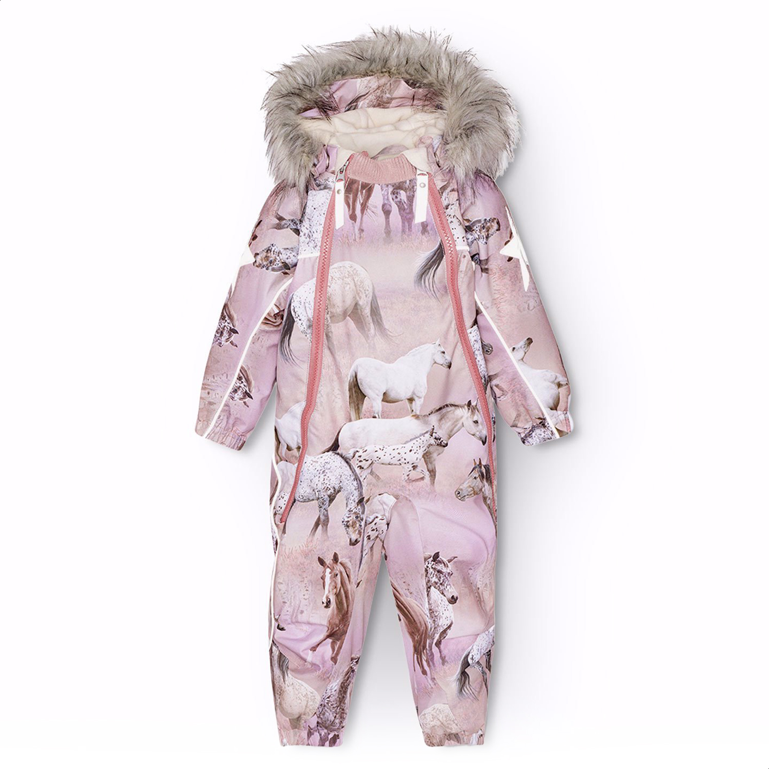 Snowsuit in recycled polyester for a cold winter with a print of horses in pink and purple shades. The snowsuit has a detachable hood with fleece, two zippers with fleece-lined chin guard to prevent the skin from getting caught. The snowsuit has an inner wind flap and elastic at the waist, sleeve, and leg openings to keep snow, rain, and wind out. The suit has reflectors along the side seams, around the hood, and large star-shaped reflectors on both sleeves and legs to increase visibility in traffic. The suit is lined with 3M™ Thinsulate™, which is lightweight and provides greater mobility for the child. Features: Windproof, waterproof, and breathable. Water column pressure: 20,000 mm. Breathability: 20,000 g/m2/24h. Waterproof seams. 3M™ Thinsulate™ insulation. PFC-free (PFOS and PFOA). Reflective edges and reflectors on legs and arms to increase visibility in traffic. 2 x zipper closure for easy and quick dressing. Detachable hood, lined with fleece and a removable faux fur trim. Internal fleece lining at knees, bottom, and back for extra insulation in vulnerable areas. Snow gaiter at leg opening and detachable rubber boot strap. Fleece lining in pockets.