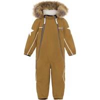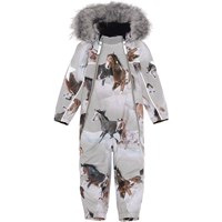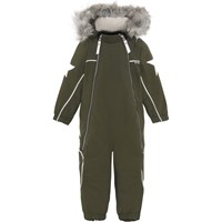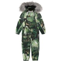 Pyxis is a functional snowsuit in green for babies and small children. Pyxis is perfect for extremely cold days but also ordinary winter days. The high level of breathability helps regulate a child's body temperature so it does not become too cold or overheated. On warmer winter days, a child can wear the jacket with a thin underlayer, but on extremely cold days, you can add an extra layer underneath. Pyxsis is also a good choice for less active moments. It has a detachable hood, two slanted zippers for easy dressing, snow flaps at the legs and rubber stirrups. Pyxis has Molo's iconic star reflectors on the upper arms and on the back of the legs. The snowsuit is windproof, waterproof and breathable. The outer fabric is made from 59% recycled nylon, the 3M™ Thinsulate™ padding from 83% recycled polyester and the lining from 100% recycled nylon. The snowsuit has taped seams. This product has a water-resistant, PFC-free surface treatment (Does not contain, e.g. PFOS, PFOA, etc). Water column pressure: 15.000 mm. Breathable: 15.000 g/m2/24hr.