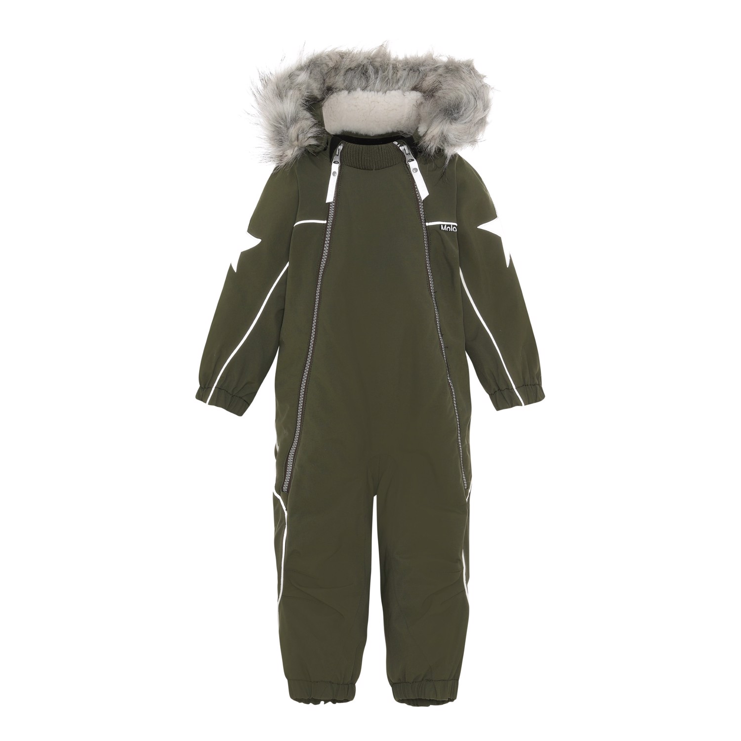Pyxis is a functional snowsuit in green for babies and small children. Pyxis is perfect for extremely cold days but also ordinary winter days. The high level of breathability helps regulate a child's body temperature so it does not become too cold or overheated. On warmer winter days, a child can wear the jacket with a thin underlayer, but on extremely cold days, you can add an extra layer underneath. Pyxsis is also a good choice for less active moments. It has a detachable hood, two slanted zippers for easy dressing, snow flaps at the legs and rubber stirrups. Pyxis has Molo's iconic star reflectors on the upper arms and on the back of the legs. The snowsuit is windproof, waterproof and breathable. The outer fabric is made from 59% recycled nylon, the 3M™ Thinsulate™ padding from 83% recycled polyester and the lining from 100% recycled nylon. The snowsuit has taped seams. This product has a water-resistant, PFC-free surface treatment (Does not contain, e.g. PFOS, PFOA, etc). Water column pressure: 15.000 mm. Breathable: 15.000 g/m2/24hr.