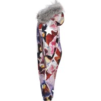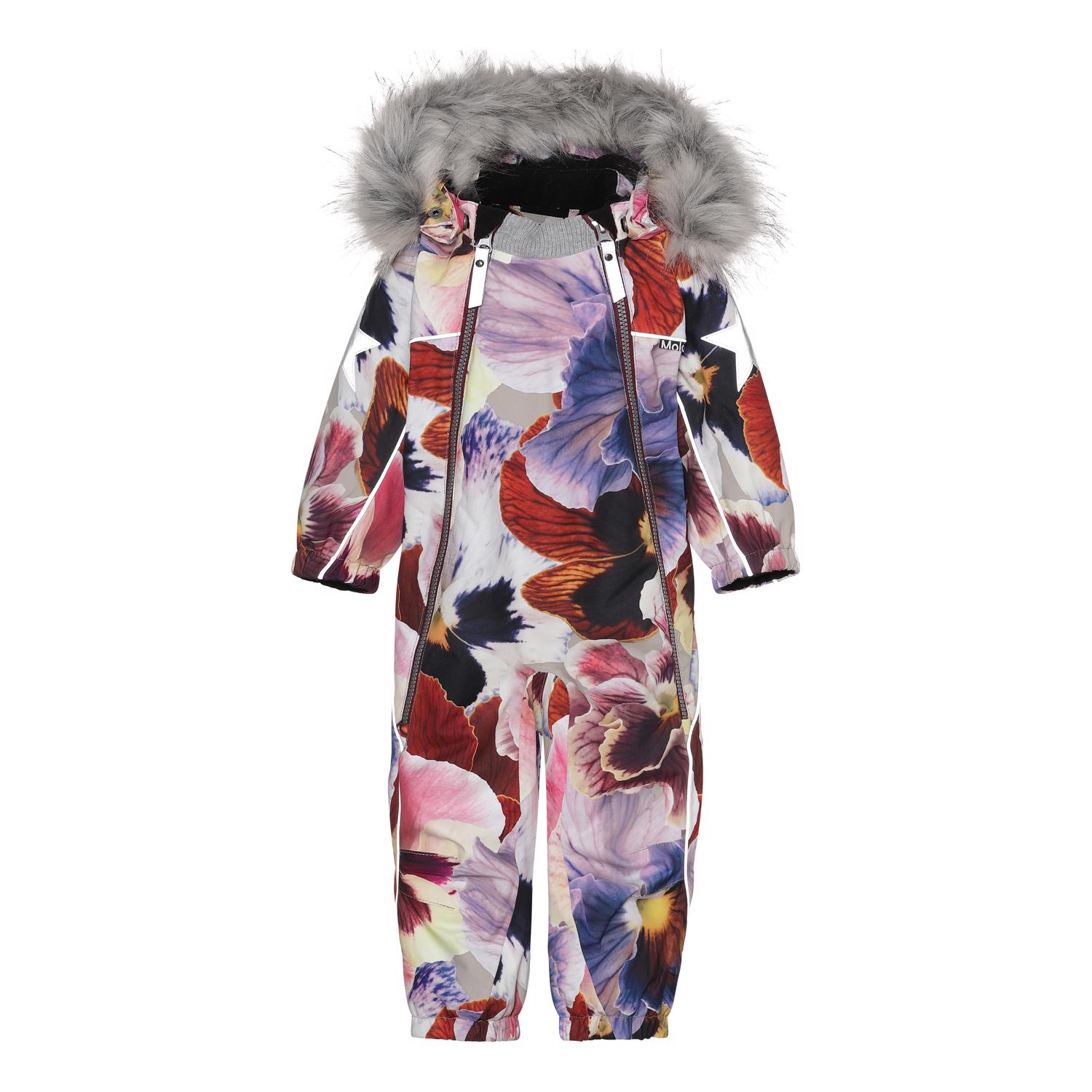 Pyxis is a functional snowsuit for babies and small children with a large floral print. It has a detachable hood and two slanted zippers on the front that make it easy to get on and off. It has snow flaps at the legs and a rubber stirrup for underneath the feet. It has Molo's iconic star reflectors on the top of the sleeves and on the back of the legs. The snowsuit is made in a windproof, waterproof and breathable fabric, while the lining and interlining are recycled and made of recycled polyester. The snowsuit has taped seams. This product has a water resistant, PFC-free surface treatment (Does not contain, e.g. PFOS, PFOA, etc). The water column pressure and breathability are greatly improved and are now: water coloumn pressure: 15.000 mm and breathable: 15.000 g/m2/24hr.