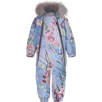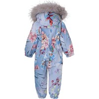 Pyxis is a functional snowsuit for babies and small children in light blue with a floral print. It has a detachable hood with a faux fur edge (also detachable), two slanted zippers for easy dressing, snow flaps and rubber stirrups at the legs and Molo's iconic star reflectors at the top of the sleeves and at the back of the legs. The snowsuit is constructed in a windproof, waterproof and breathable quality with 3M™ Thinsulate™. It has high quality fleece in vulnerable places and taped seams. This product has a water resistant, PFC-free surface treatment (Does not contain, e.g. PFOS, PFOA, etc). Water column pressure: 15.000 mm. Breathability: 15.000 g/m2/24hrs.