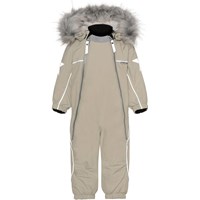 Pyxis is a functional snowsuit for babies and small children in beige. It has a detachable hood and two slanted zippers on the front that make it easy to get on and off. It has snow flaps at the legs and a rubber stirrup for underneath the feet. It has Molo's iconic star reflectors on the top of the sleeves and on the back of the legs. The snowsuit is made in a windproof, waterproof and breathable fabric, while the lining and interlining are recycled and made of recycled polyester. The snowsuit has taped seams. This product has a water resistant, PFC-free surface treatment (Does not contain, e.g. PFOS, PFOA, etc). The water column pressure and breathability are greatly improved and are now: water coloumn pressure: 15.000 mm and breathable: 15.000 g/m2/24hr.