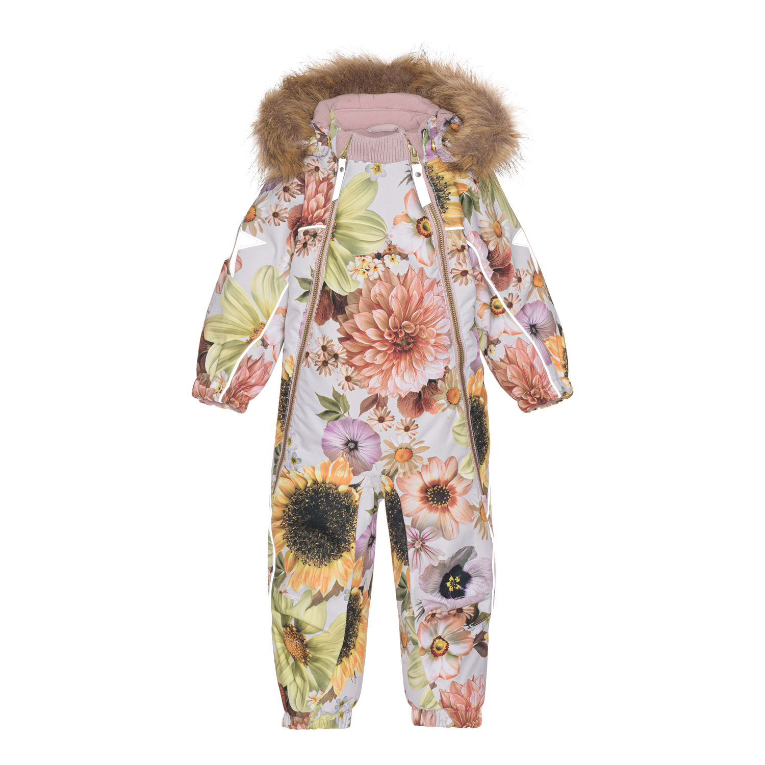 Pyxis is one of Molo''s most well-known and beloved snowsuits that is perfect for young children. The snowsuit has many features, like extremely high-water column pressure and breathability, and with its beautiful prints and colours, it''s a sure winner every year. Molo doesn''t compromise on any details when it comes to this snowsuit, and it is, of course, also produced in responsibly recycled materials. This Pyxis is in a retro floral print in light colours.