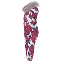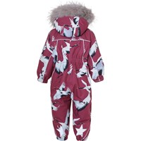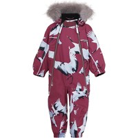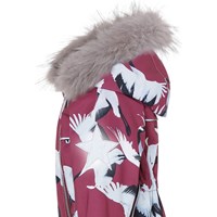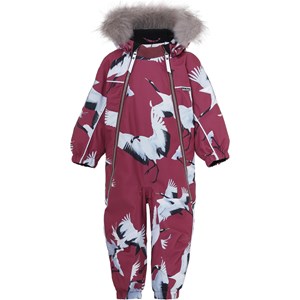 Pyxis is a functional snowsuit for babies and small children in bordeaux with a print of flying cranes. It has a detachable hood with a faux fur edge (also detachable), two slanted zippers for easy dressing, snow flaps and rubber stirrups at the legs and Molo's iconic star reflectors at the top of the sleeves and at the back of the legs. The snowsuit is constructed in a windproof, waterproof and breathable quality with 3M™ Thinsulate™. It has high quality fleece in vulnerable places and taped seams. This product has a water resistant, PFC-free surface treatment (Does not contain, e.g. PFOS, PFOA, etc). Water column pressure: 15.000 mm. Breathability: 15.000 g/m2/24hrs.