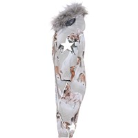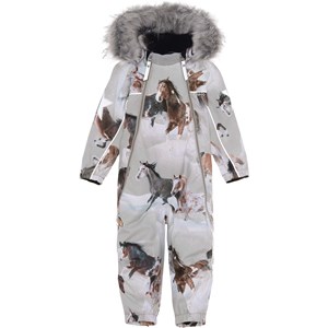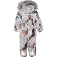 Pyxis is a functional snowsuit in light grey with a horse print for babies and small children. Pyxis is perfect for extremely cold days but also ordinary winter days. The high level of breathability helps regulate a child's body temperature so it does not become too cold or overheated. On warmer winter days, a child can wear the jacket with a thin underlayer, but on extremely cold days, you can add an extra layer underneath. Pyxsis is also a good choice for less active moments. It has a detachable hood, two slanted zippers for easy dressing, snow flaps at the legs and rubber stirrups. Pyxis has Molo's iconic star reflectors on the upper arms and on the back of the legs. The snowsuit is windproof, waterproof and breathable. The outer fabric is made from 45% recycled polyester, the 3M™ Thinsulate™ padding from 83% recycled polyester and the lining from 100% recycled nylon. The snowsuit has taped seams. This product has a water-resistant, PFC-free surface treatment (Does not contain, e.g. PFOS, PFOA, etc). Water column pressure: 15.000 mm. Breathable: 15.000 g/m2/24hr.
