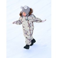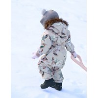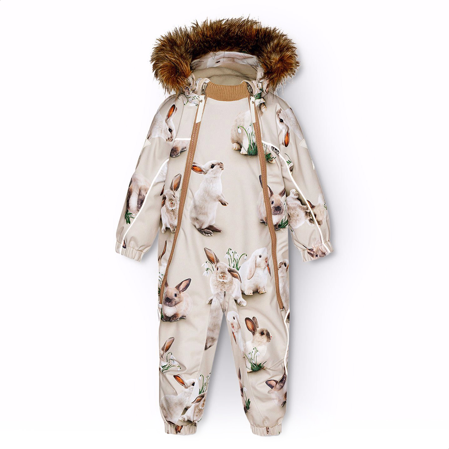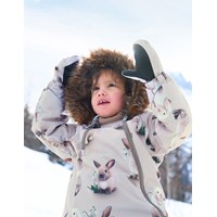 Snowsuit in recycled polyester for a cold winter with a cute rabbit print among snowdrops on a grey background. The snowsuit has a detachable hood with fleece, two zippers with fleece-lined chin guard to prevent the skin from getting caught. The snowsuit has an inner wind flap and elastic at the waist, sleeve, and leg openings to keep snow, rain, and wind out. The suit has reflectors along the side seams, around the hood, and large star-shaped reflectors on both sleeves and legs to increase visibility in traffic. The suit is lined with 3M™ Thinsulate™, which is lightweight and provides greater mobility for the child. It also has front pockets with waterproof zippers. Features: Windproof, waterproof, and breathable. Water column pressure: 20,000 mm. Breathability: 20,000 g/m2/24h. Waterproof seams. 3M™ Thinsulate™ insulation. PFC-free (PFOS and PFOA). Reflective edges and reflectors on legs and arms to increase visibility in traffic. 2 x zipper closure for easy and quick dressing. Detachable hood, lined with fleece and a removable faux fur trim. Internal fleece lining at knees, bottom, and back for extra insulation in vulnerable areas. Snow gaiter at leg opening and detachable rubber boot strap. Fleece lining in pockets.