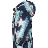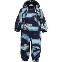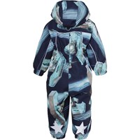 Pyxis is a functional snowsuit for babies and small children in a print of futuristic time machines. It has a detachable hood, two slanted zippers for easy dressing, snow flaps and rubber stirrups at the legs and Molo's iconic star reflectors at the top of the sleeves and at the back of the legs. The snowsuit is constructed in a windproof, waterproof and breathable quality with 3M™ Thinsulate™. It has high quality fleece in vulnerable places and taped seams. This product has a water resistant, PFC-free surface treatment (Does not contain, e.g. PFOS, PFOA, etc). Water column pressure: 15.000 mm. Breathability: 15.000 g/m2/24hrs.