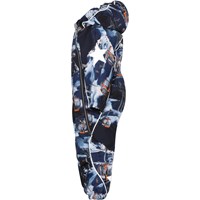 Pyxis is a functional snowsuit for babies and small children in blue with a print of ski lifts. It has a detachable hood and two slanted zippers on the front that make it easy to get on and off. It has snow flaps at the legs and a rubber stirrup for underneath the feet. It has Molo's iconic star reflectors on the top of the sleeves and on the back of the legs. The snowsuit is made in a windproof, waterproof and breathable fabric, while the lining and interlining are recycled and made of recycled polyester. The snowsuit has taped seams. This product has a water resistant, PFC-free surface treatment (Does not contain, e.g. PFOS, PFOA, etc). The water column pressure and breathability are greatly improved and are now: water coloumn pressure: 15.000 mm and breathable: 15.000 g/m2/24hr.