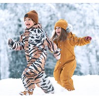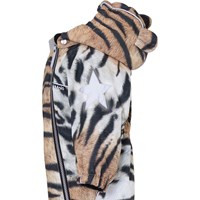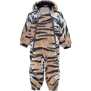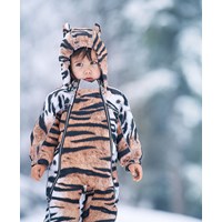 Pyxis is a functional snowsuit for babies and small children in a tiger print. It has a detachable hood, two slanted zippers for easy dressing, snow flaps and rubber stirrups at the legs and Molo's iconic star reflectors at the top of the sleeves and at the back of the legs. The snowsuit is constructed in a windproof, waterproof and breathable quality with 3M™ Thinsulate™. It has high quality fleece in vulnerable places and taped seams. This product has a water resistant, PFC-free surface treatment (Does not contain, e.g. PFOS, PFOA, etc). Water column pressure: 15.000 mm. Breathability: 15.000 g/m2/24hrs.