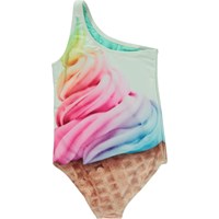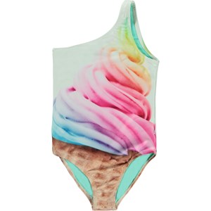 One shoulder swimsuit with a placement print on the front and back of a delicious ice cream cone in rainbow colours. The suit has a wide, asymmetrical strap and is constructed in recycled, stretchy polyester, which makes it comfortable and easy to slip on and off. It offers a high level of 50+ UV protection from the sun. The product is CE-marked and tested according to standard EN-13758-1.