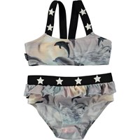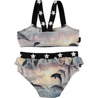 Lovely bikini with a digital dolphin print, ruffle details at the bottoms, a black waistband and straps with printed Molo stars. The straps are fastened at the middle of the back. The elastic fabric allows for easy movement. This product has a UV protection of 50+ and has been tested before, during and after use.