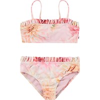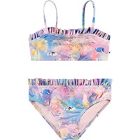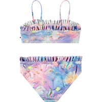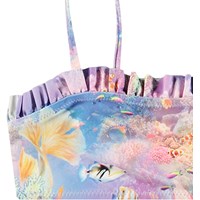 Stretchy bikini for active children, made from recycled polyester with UV protection 50+. The bikini top is wide ruffle detail, thin straps, and is fully lined. The bottom has an elastic waist with a ruffle edge, a regular fit, and is also fully lined. The bikini is purple and blue with a colourful coral reef pattern. The product is CE-marked and tested according to standard EN-13758-1.