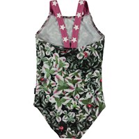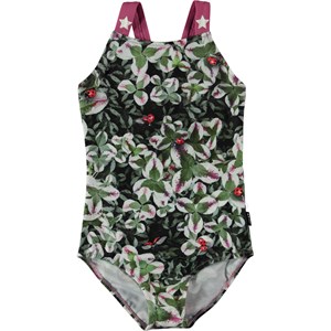Nakia is a swimsuit in the 'Clover' print. The suit has a high neck and has straps with stars. Molo's swimwear has a 50+ UV protection.