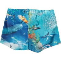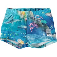 Blue, snug fit baby swim shorts in all over print of the different zones of the ocean and the marine life that live there. The swim shorts are roomy enough for a nappy. They have elastic at the waist to ensure a secure fit. They are constructed in recycled, stretchy polyester, which makes it extremely comfortable and easy to slip on and off. It offers a high level of 50+ UV protection from the sun. The product is CE-marked and tested according to standard EN-13758-1.