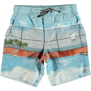 Nario is a pair of swim trunks in the 'Basket Court' print. The trunks have ties at the waist and a back pocket. They are comfortable and easy to move around in. Molo's swimwear has a 50+ UV protection. Mix and match with the season's rash guards for extra protection.