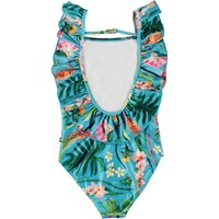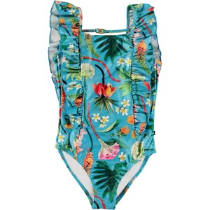 Blue swimsuit with an all over print of exotic leaves and plants. The suit has lovely ruffles at the sides that continue up over the shoulders and around the deep back opening. There is a small strap with a closure on the back to ensure that the suit fits perfectly. The swimsuit is constructed in recycled, stretchy polyester, which makes it comfortable and easy to slip on and off. It offers a high level of 50+ UV protection from the sun. The product is CE-marked and tested according to standard EN-13758-1.