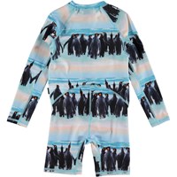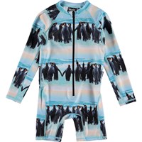 Neka LS is a practical, long sleeve UV swimsuit in the 'Penguin Stripe' print. The swimsuit has a long zipper on the front and is constructed in an elastic fabric that makes it easy to get on and off and makes it easy to move around in. The swimsuit covers most of the upper arms and legs, protecting the areas where children typically get sunburned. Molo's swimwear has 50+ UV protection. The product is CE-marked and tested according to standard EN-13758-1.
