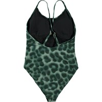 Nellys is a swimsuit in adult sizes so you can match your child's swimsuit. The suit is in green with a leopard print. Nellys has narrow, crossed straps on the back and a removable insert at the chest. The product is CE-marked and tested according to standard EN-13758-1.