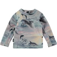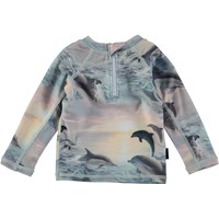 Cool long sleeve baby rash guard with a digital dolphin print. The back neck zipper and the elastic fabric allow for easy movement and make it easy to pull on and off. The rash guard covers the shoulders and arms to protect against the sun's rays. It is easy to mix and match with the season's various bottoms to create a unique look. This product has a UV protection of 50+ and has been tested before, during and after use.