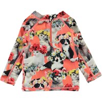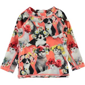 Nemo is a long sleeve UV rashguard for little kids to protect against the sun''s harmful rays. All of Molo''s swimwear has a UV protection of 50+. This Nemo style has a humorous print of cats with floral wreaths on their heads. The top is lightweight and comfortable and easy to move around in. Molo offers bottoms that match this top. The product is CE-marked and tested according to standard EN-13758-1.