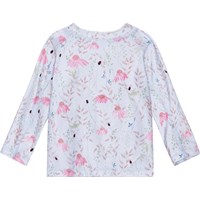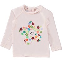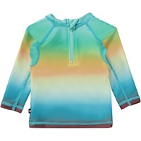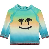 Long sleeve rash guard for small children. It is in gradient turquoise, yellow and blue. There is a placement print on the front of a smiling face with palm tree eyes. The rash guard has a practical zip closure on the back to make it easy to slip on and off. It is constructed in recycled, stretchy polyester and offers a high level of 50+ UV protection from the sun. The product is CE-marked and tested according to standard EN-13758-1.