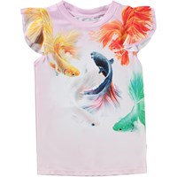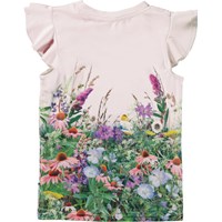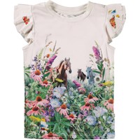 Pink rash guard with a placement print on the front and back of galloping horses in a meadow of wildflowers. It has short sleeves with double layer ruffles, which creates a lovely, wavy effect. The rash guard is constructed in recycled polyester and offers a high 50+ UV protection. The top is lightweight and comfortable while also offering protection from the sun. The product is CE-marked and tested according to standard EN-13758-1.