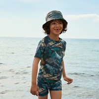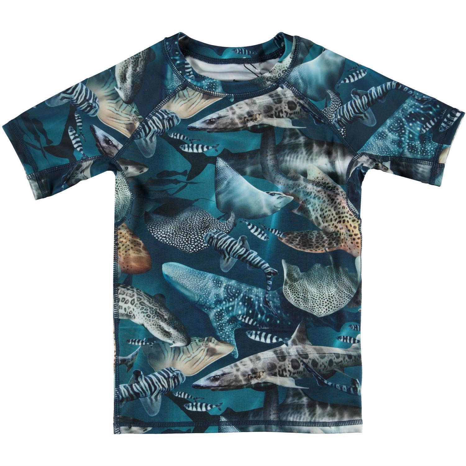 Neptune is a wonderful UV rash guard that protects against the sun's harmful rays. This Neptune has a fun motif of sharks in different animal prints. The top is thin and comfortable to wear because it is easy to move around in. Mix and match the top with a pair of swim trunks for a cool surfer look. Molo's swimwear has a UV protection of 50+. The product is CE-marked and tested according to standard EN-13758-1.