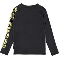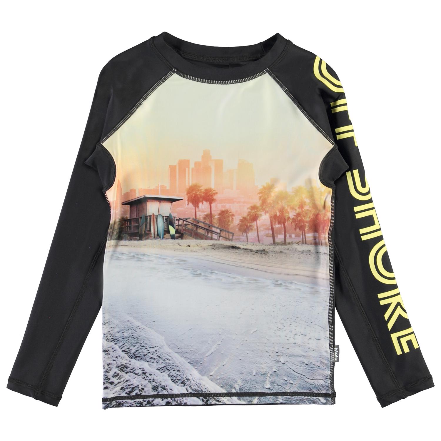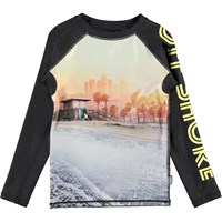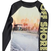 Neptune LS is a fabulous UV rashguard with black sleeves and with the text ''Off Shore'' and a print of the shore, palm trees and surfboards on the front. It protects against the sun''s harmful rays. The top is lightweight and comfortable and easy to move around in. Wear the top with matching shorts for a cool, surfer look. Molo''s swimwear has a UV protection of 50+. The product is CE-marked and tested according to standard EN-13758-1.