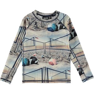 Neptune is a long sleeve rash guard in the 'Volleyball Sunset' print. It protects against the sun's harmful rays because Molo's swimwear has a 50+ UV protection. The rash guard is lightweight, comfortable and allows for easy movement. There are matching bottoms in the same print.