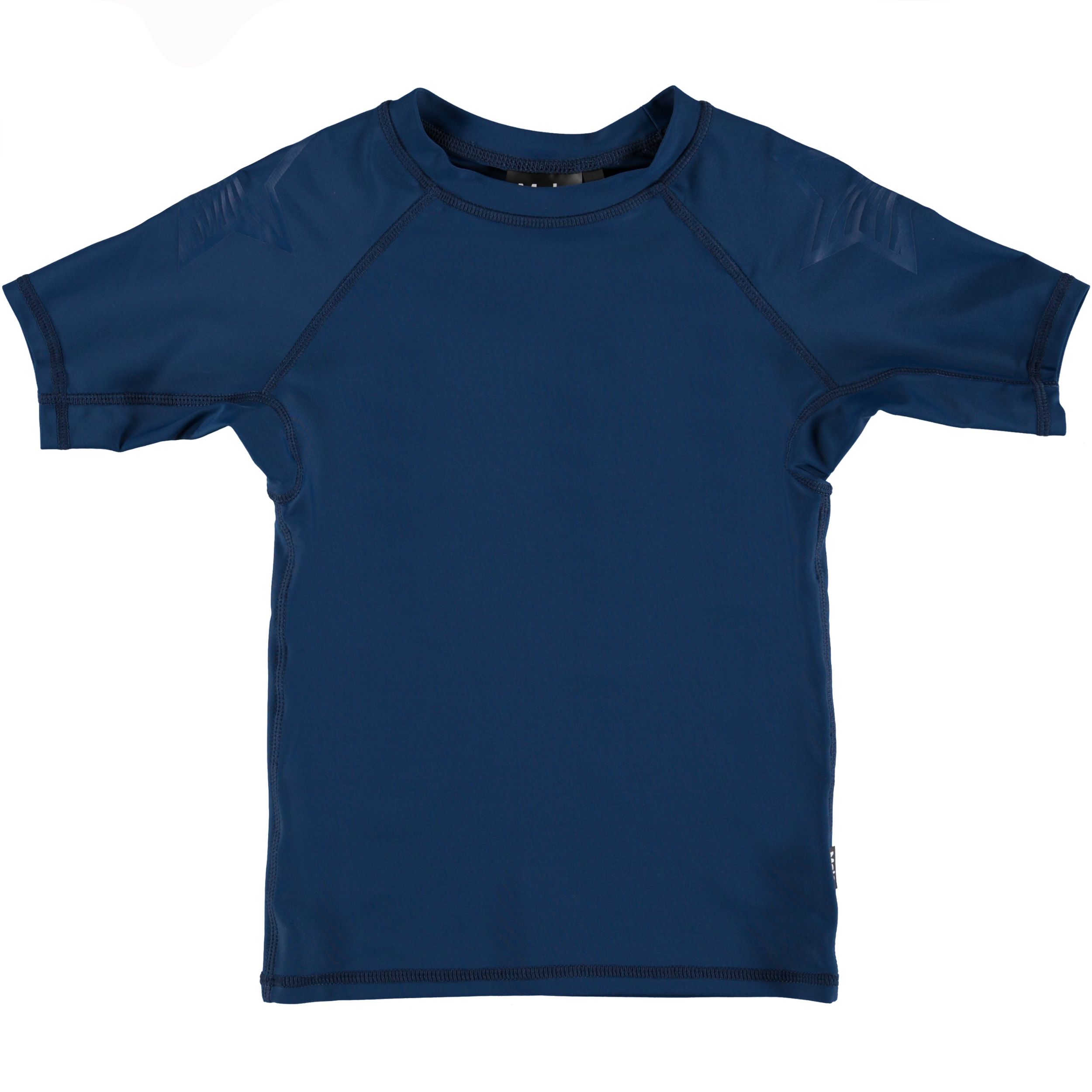 "Dark blue rashguard that protects against the sun's harmful rays with +50 UV protection that all Molo's swimwear has. It is comfortable and lightweight to ensure easy movement. Wear it with trunks for a cool beach look. The product is CE-marked and tested according to standard EN-13758-1.
