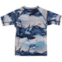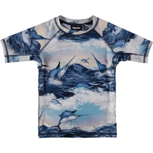 Neptune is a rash guard in the 'Jumping Swordfish' print. It protects against the sun's harmful rays because Molo's swimwear has a 50+ UV protection. The rash guard is lightweight, comfortable and allows for easy movement. There are matching bottoms in the same print.