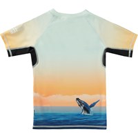 Rash guard in shades of blue and orange with a placement print on the front and back. It has short, t-shirt sleeves and a Molo Swim logo on one sleeve. The print is of a sunset over the ocean, where the tail of a whale forms ahappy emoji with the help of two playful dolphins. The motif continues on the back with a humpback whale that is diving into the waves. The rash guard is constructed in recycled polyester and has a lightweight, comfortable fit that is easy to pull on over the head. The top offers a high level of 50+ UV protection from the sun. The product is CE-marked and tested according to standard EN-13758-1.