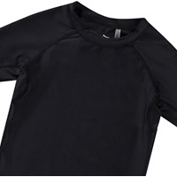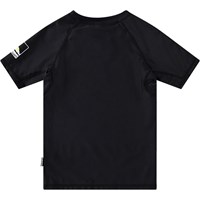 Black rashguard for active children made of recycled polyester with UV protection 50+. The rashguard has a tight fit, stand-up collar, short raglan sleeves and is comfortable to wear in the stretchy material. The product is CE-marked and tested according to standard EN-13758-1.
