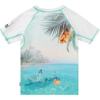 White short sleeve rashguard made of recycled polyester with UV protection 50+.The rashguard has a close fit, stand-up collar, and short raglan sleeves. It is comfortable to wear in the stretchy material. The rashguard has print of a beautiful beach and a cheetah on a surfboard. The product is CE-marked and tested according to standard EN-13758-1.