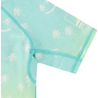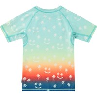 Raibow-coloured short sleeve rashguard made of recycled polyester with UV protection 50+.The rashguard has a close fit, stand-up collar, and short raglan sleeves. It is comfortable to wear in the stretchy material. The rashguard is rainbow-coloured with a print of smiling palm faces. The product is CE-marked and tested according to standard EN-13758-1.
