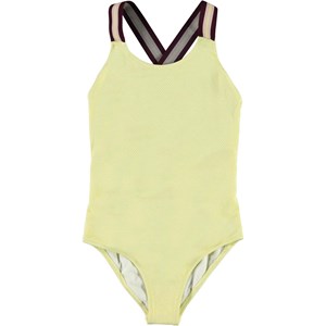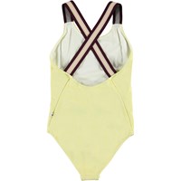 Neve is a light yellow swimsuit with thin silver threads woven in as well as wide striped straps that cross on the back. The straps are in gold and bordeaux stripes. Molo's swimwear has a UV protection of 50+. The product is CE-marked and tested according to standard EN-13758-1.